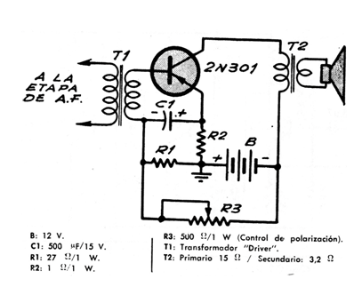 Este circuito de una antigua publicación argentina de la década de 1970 utiliza un transistor de potencia para obtener una salida de aproximadamente 4 vatios en un conmutador común a partir de 500 mW a 1 W de salida de una radio u otro pequeño equipo de con. Podemos utilizar un TIP32 con disipador y eventualmente cambiando R2 para obtener el mejor rendimiento con ajuste de R3. Los transformadores se pueden obtener en equipos antiguos que usen estos componentes.
