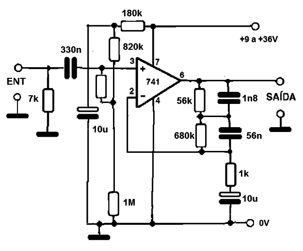 Encontramos la configuración básica de este circuito en una antigua publicación Inglesa que se ocupa de los proyectos con el amplificador operacional 741. La finalidad de este circuito es en la recuperación de la música grabada en vinilo, para pasarlos a otros medios tales como CD y MP3 a través del computador. El circuito está diseñado para funcionar puck-ups magnéticos o fonocaptores de baja impedancia. El circuito tiene una compensación para las señales recuperadas. La fuente no tiene que ser simétrica y ambas señales de entrada y de salida debe realizarse con cables blindados. La unidad tiene un consumo bajo, del orden de unos pocos miliamperios. Si se utiliza la fuente de alimentación externa, debe tener un excelente filtrado para evitar los ronquidos. Para una versión estéreo deben ser montados dos circuitos, uno para cada canal, con una fuente de alimentación común equivalente a los amplificadores operacionales 741 puede ser utilizado.