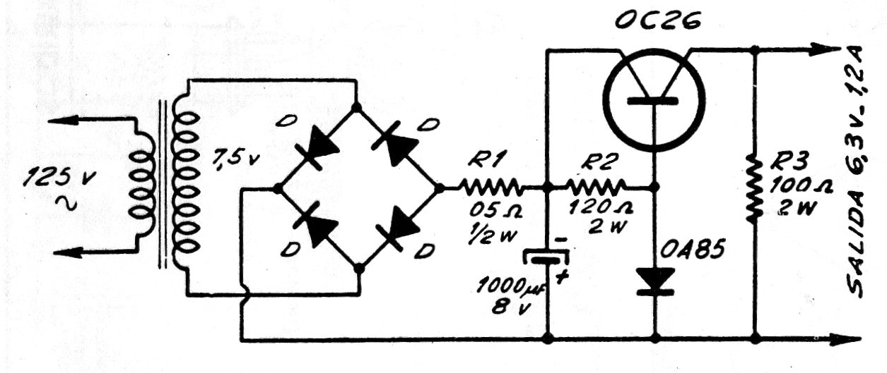 Esta pequeña fuente de una publicación de los años 1970 utiliza un transistor de germanio. Podemos utilizar un transistor de silicio como el TIP32 y en lugar del OA85 un zener de 6V6 o cerca. El transistor debe estar dotado de disipador y el secundario del transformador debe tener 1 o 1,2 A. Los diodos pueden ser los 1N4002.