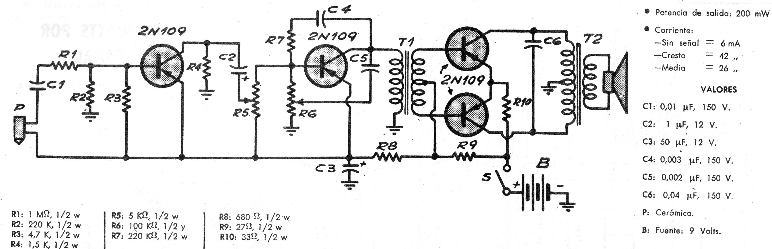 Este es un circuito de amplificador que se encuentra en electrolas o en reproductores de discos portátiles de los años 1970. Este circuito se encontró en una publicación argentina de la época. Los transistores son de germanio y los otros componentes críticos son los transformadores. Estos componentes se pueden obtener en radios transistorizados, grabadores y otros equipos de la época.