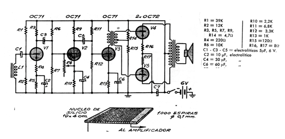 Este amplificador es antiguo, de una publicación de 1973. En él se utilizan transistores de germanio y transformadores que no son más fáciles de obtener. Sin embargo, la etapa de preamplificación se puede aprovechar con transistores BC558 y el paso de salida puede ser reemplazado por un circuito más moderno, con el LM386, por ejemplo. Observe que el teléfono debe ser apoyado sobre la bobina. Con algunos tipos de teléfonos modernos en los que la señal es digital este circuito no funciona.