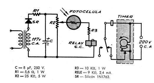 Este circuito es de una publicación de los años 1970. Cuando la célula, un LDR del tipo grande recibe luz, el relé es accionado y el temporizador del tipo electromecánico (motor) entra en funcionamiento. R1 es de hilo y el relé de tensiones entre 48 V y 120 V sensible. El circuito no necesita el transformador si se alimenta directamente a través de la red de 110 V.
