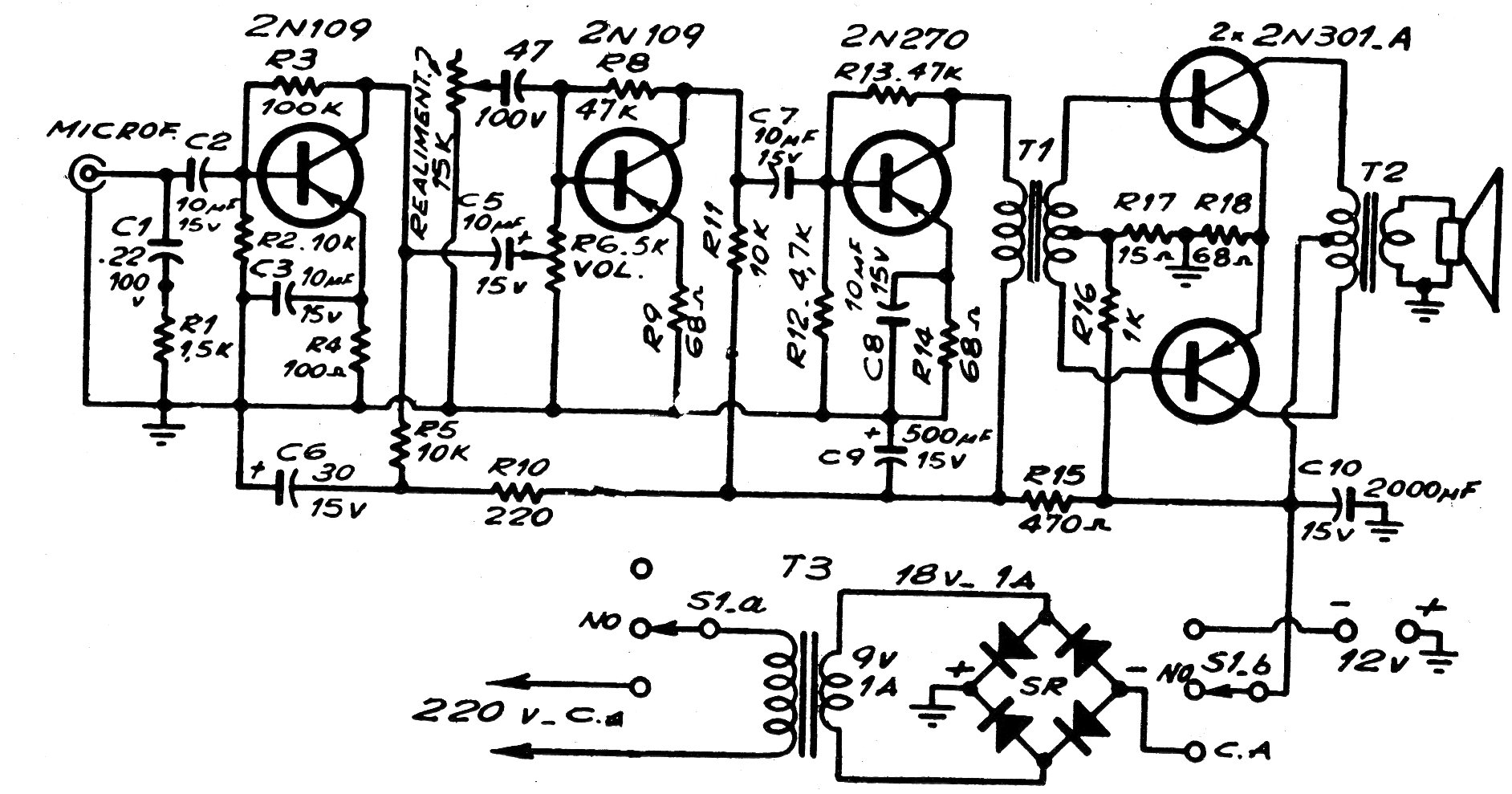 Este circuito en contrafase es de una publicación de 1973, pudiendo funcionar con tensiones de red o de 12 V. Los transistores de salida son del tipo de potencia que eventualmente pueden ser cambiados por equivalentes modernos de silicio, pero con eventuales alteraciones de R17 y R18 . Los transformadores son los elementos críticos de este circuito. Vale el circuito mucho más como referencia para una eventual recuperación de un equipo.