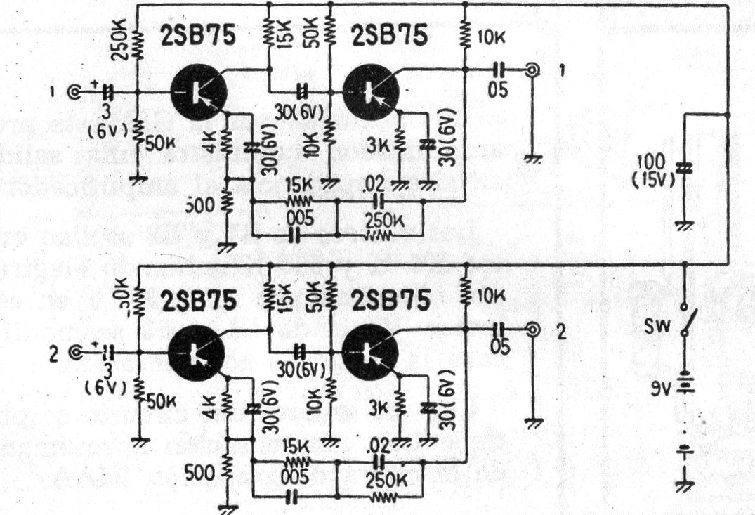 Este antiguo circuito de la década de 1970 utiliza transistores de germanio y es alimentado por batería o fuente de 9 V. El circuito tiene consumo muy bajo y alta impedancia de entrada, pudiendo excitar la mayoría de los amplificadores comunes. Para los transistores de silicio se deben cambiar varios resistores de polarización.