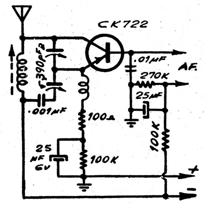 Obtenido en una publicación argentina de 1973, este circuito emite la señal de un pequeño tocadiscos a un receptor AM próximo. El circuito funciona con tensiones de 6 a 9 V y tiene un alcance de algunos metros. El transistor puede ser un actual como el BC558 y la bobina está formada por 80 a 100 espiras de hilo 28 en un pequeño bastón de ferrita. Los capacitores de 25 uF pueden ser de 220 uF, que es el valor actual estandarizado.
