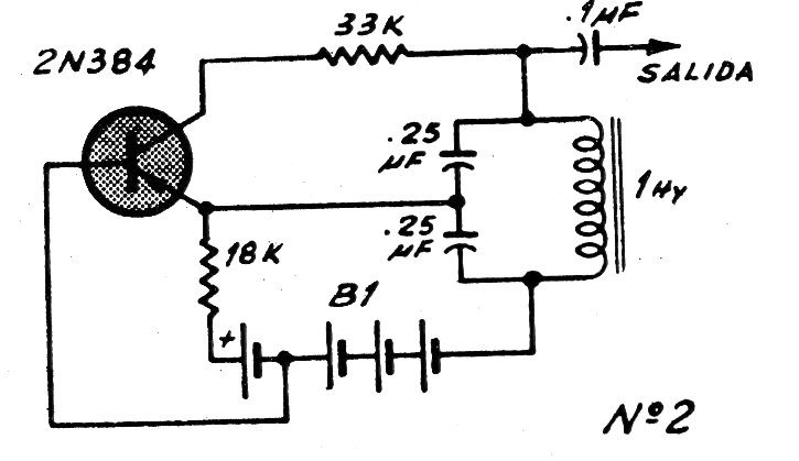 Este circuito, de una publicación antigua, también puede utilizar transistores modernos. Observe que la fuente es doble con una rama de 4,5 V (3 pilas) y otra rama de 1,5 V (1 pilas). Esta configuración es necesaria para el tipo de polarización que se emplea. La frecuencia de la señal senoidal generada es de aproximadamente 1 kHz, dependiendo básicamente del choque.