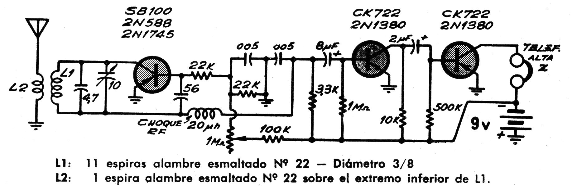 Este receptor tiene la recepción de señales de la banda de aficionados de los 6 metros, utilizando sólo tres transistores y escucha en auriculares de alta impedancia. Los transistores son de germanio en la versión original, pero los cambios de los resistores de polarización posibilitan el uso de transistores de germanio. El consumo es muy bajo y la antena debe ser de tipo telescópico de al menos 80 cm de longitud.