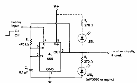 Cuando la entrada de este circuito va al nivel alto, los LEDs parpadean alternativamente. La frecuencia puede ser cambiada en R1 y la alimentación debe ser la misma de la lógica de disparo. El circuito es de una publicación americana sobre timers de 1977.