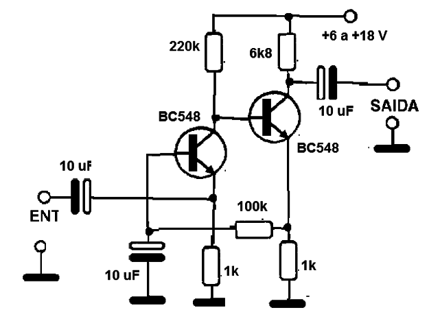 La versión original de este circuito se obtuvo en una publicación de Estados Unidos de 1992, pero se puede montar fácilmente hoy con transistores BC548. Este es un amplificador de dos transistores para fuentes de señal de baja impedancia. El consumo muy bajo permite su alimentación por baterías. Cables de entrada y señales de salida deben ser blindados. Si se utiliza la fuente de alimentación, debe tener una excelente filtraje. Una posibilidad interesante es el uso de BC549 para Q1, ya que este transistor tiene un nivel de ruido más bajo. Altavoces pequeños, pick-up magnéticos y instrumentos musicales se pueden conectar a entrada de esto circuito. Su salida es una señal de unos pocos cientos de milivolts, lo suficiente para excitar a la mayoría de los amplificadores.