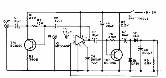 Este circuito es de una publicación de 1976, pudiendo ser montado con amplificadores operacionales más modernos. Los transistores pueden ser el BC548. El circuito comprime la banda dinámica de las señales de audio, aumentando así el rendimiento de transmisores modulados en amplitud.