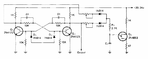 Encontramos este circuito en una publicación para radioaficionados de 1974. Los transistores bipolares pueden ser los BC548 y el unijunción puede ser el 2N2646. El rango de frecuencias generadas depende del condensador C.