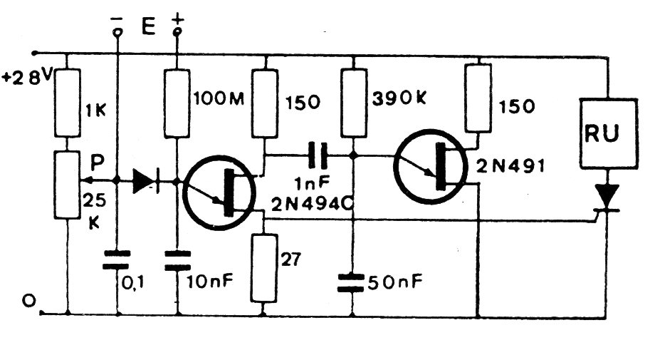 Encontramos este circuito en una documentación francesa antigua. El diodo es de uso general y el relé es de 28 V. El circuito tiene una impedancia de entrada de 100 M.