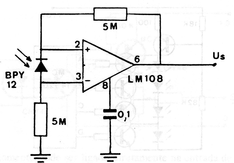 Este circuito utiliza un foto-diodo como sensor y su ganancia dada por los resistores de 5 M (4M7). El amplificador operacional puede ser el 741 u otro alimentado por una fuente simétrica conveniente.