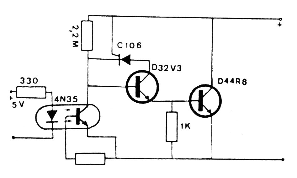 Este circuito dispara un SCR y la carga debe ser conectada en serie con la alimentación. El transistor de potencia puede ser un BD135 el otro puede ser un BC548. La alimentación depende de la carga. El circuito funciona como escudo para microcontroladores. El resistor sin valor, en la publicación original, es de 2M2.