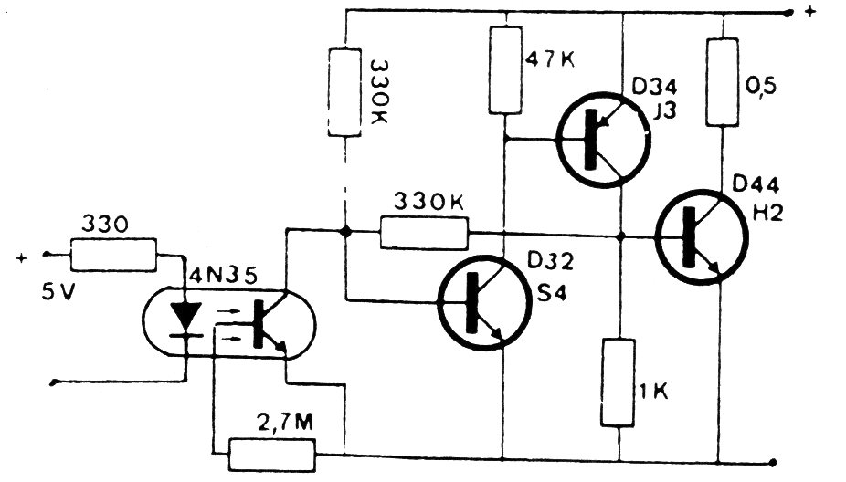 Este circuito se puede utilizar como shield aislado para microcontroladores. La alimentación depende del relé o de la carga utilizados. El transistor de potencia puede ser un BD135 para cargas hasta 500 mA, y los demás pueden ser el par formado por los BC548 y BC558. El circuito es de una documentación francesa.