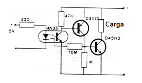 Este circuito tiene por objetivo controlar un relé de potencia conectado al colector del segundo transistor a partir de mando óptico por foto-acoplador. El circuito se puede utilizar como escudo aislado y su alimentación depende del relé empleado. El transistor de potencia puede ser el BD135 y el conductor un BC558.