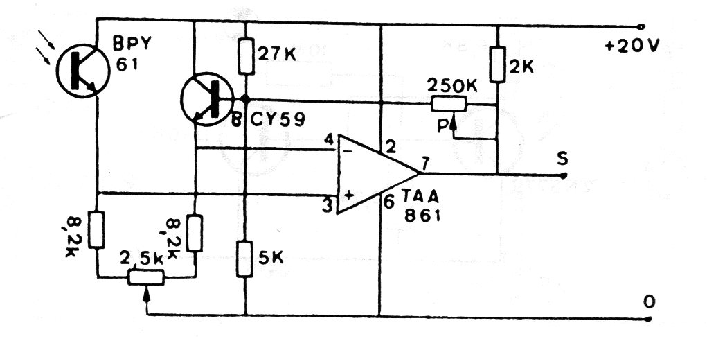 Este circuito utiliza una configuración de amplificador diferencial para manejar un operacional conmutando una salida. El amplificador integrado utilizado es poco común actualmente, pudiendo ser probados equivalentes modernos. En este caso, dependiendo del funcionamiento, la tensión de alimentación puede ser menor.