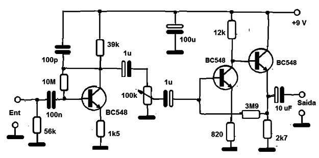 Este excelente preamplificador de audio de tres transistores es adecuado para su uso con micrófonos de alta impedancia. Los transistores pueden ser el BC548 y la alimentación una batería de 9 V. Si se utiliza la fuente, el filtrado debe ser excelente. El consumo es muy bajo. El circuito original es de una publicación Inglesa, de 1979 se han realizado cambios para que sea factible hoy en día. Cables de entrada y de salida deben ser blindados. El nivel de la señal de salida es suficiente para excitar la entrada de la mayoría de los amplificadores. La impedancia de entrada es alta y la impedancia de salida baja. El potenciómetro controla la ganancia del bucle y debe ser ajustada para obtener una salida de amplificador de potencia sin distorsión.