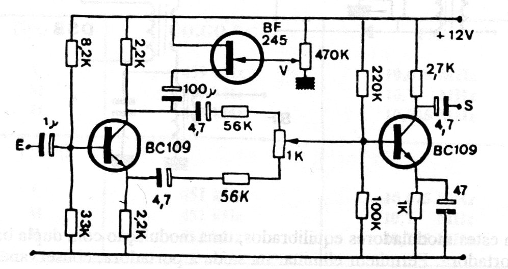De este circuito permite utilizar un potenciómetro remoto para control de volumen sin el peligro de introducción de zumbidos. El circuito es de una documentación francesa antigua y los transistores bipolares pueden ser los equivalentes modernos BC549. Los cables de señal deben ser blindados.