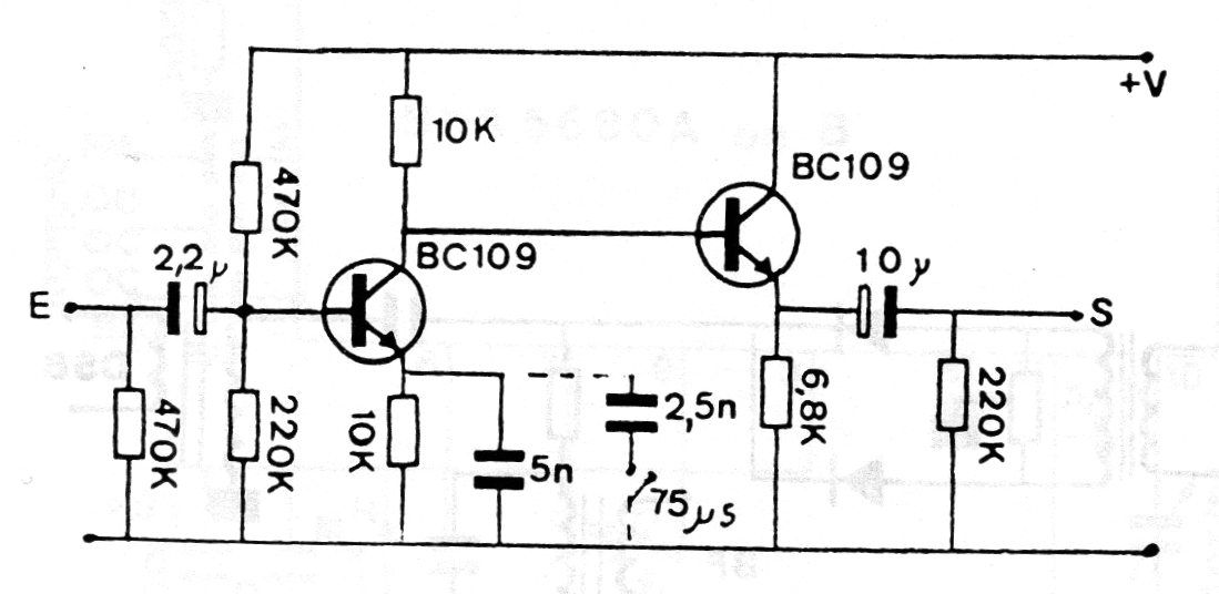 Esta es una versión mejorada del circuito anterior (CIR6767S), ya que tiene un paso adicional de amplificación. Los transistores pueden ser los tipos equivalentes más modernos BC549 y si se monta en una placa separada, los cables de señal deben ser blindados. La alimentación puede oscilar entre 9 y 15 V.