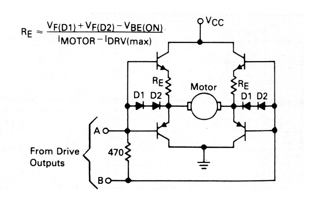 Este circuito fue encontrado en una antigua publicación estadounidense. Los transistores deben tener corrientes de acuerdo con el motor controlado. Por ejemplo, BD135 y BD136 para hasta 500 mA. El control se realiza por los niveles lógicos de las entradas. Los transistores deben estar dotados de disipadores de calor.