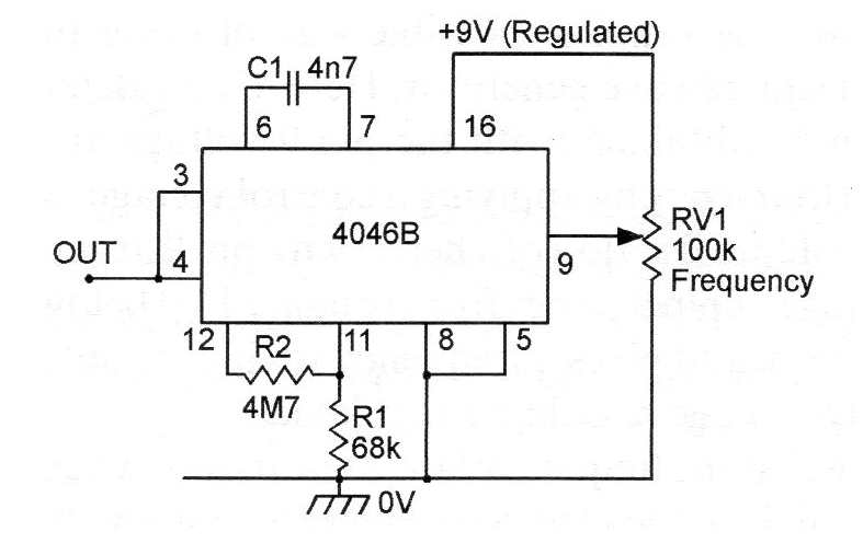 Este VCO con un circuito integrado CMOS 4046 genera señales cuya frecuencia superior depende de C1.R1 y la inferior de C1 (R1 + R2) fue encontrada en una publicación inglesa. Se puede utilizar como escudo para sensores y la alimentación puede quedar entre 3 y 12 V. Podemos usarlo como un convertidor analógico (voltaje) en digital (frecuencia) para diversas aplicaciones microcontroladas.