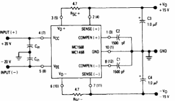El circuito integrado utilizado en esta configuración es poco común. Se trata de un regulador de fuente simétrica con sólo un integrado, sugerido por el Linear Databook de Motorola de 1990.