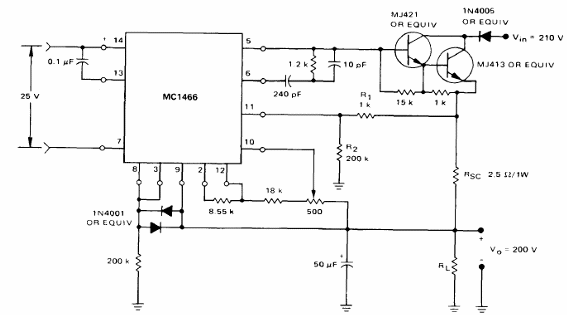 Este circuito es del Linear Databook de Motorola de 1990. El circuito integrado y los transistores son pocos comunes, pero el circuito puede ser montado con equivalentes.