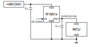 El regulador de tensión R1561x de Ricoh proporciona tensiones de salida de 1,8 a 6,0 V según el tipo. La entrada puede ser de 48/24 V y la corriente máxima de 100 mA, como se muestra en el ejemplo de aplicación del propio datasheet del componente.