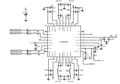 Este circuito de 10 W con el PAM8106 de Diodes Incorporated fue obtenido en 2018 en el datasheet del propio componente. Acceder el datasheet en https://br.mouser.com/datasheet/2/115/PAM8106-1323209.pdf. se pueden obtener los valores de los componentes e información adicional sobre el proyecto. El circuito funciona con tensiones de 4,6 a 15 V.