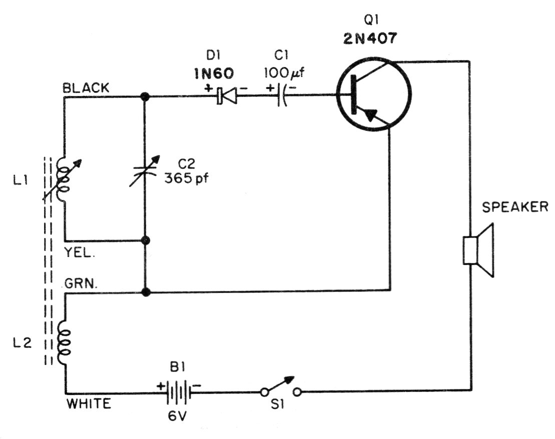 La temporización de este circuito, encontrado en una publicación americana de 1964, consiste en la producción de clics a intervalos regulares de 1 a 20 segundos. El transistor puede ser un BC548. L1 consiste en 200 espiras de hilo 28 a 32 en un bastón de ferrita y L2 en 50 espiras sobre el mismo núcleo. El altavoz puede ser de 4 o 8 ohms. Invierta uno de los devanados si no se deslice.