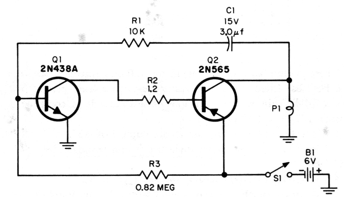Este circuito tradicional con transistores complementarios fue encontrado en una documentación americana de 1964. Los transistores pueden ser los BC548 y BC558 para lámparas hasta 100 mA la alimentación puede ser hecha con tensiones de 6 o 12 V conforme a la lámpara.