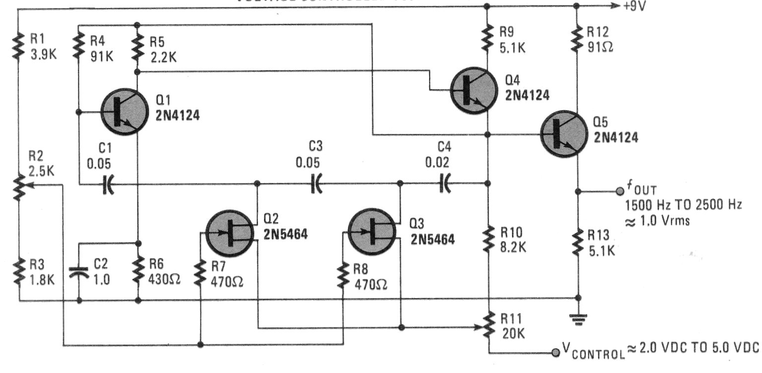 Encontramos este circuito en una Poptronics americana de la década de los 90. La revista ya no existe, pero el circuito puede ser elaborado con transistores BC548 y para los FET se pueden usar los BF245. El rango de frecuencias con los componentes indicados está entre 1 500 y 2 500 Hz.