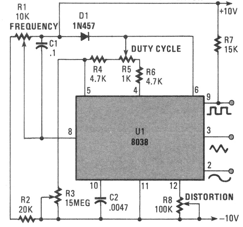 Encontramos esta configuración tradicional en un Poptronics de los años 90. La revista americana ya no existe, pero el circuito puede montarse desde que el generador de funciones 8038 sea encontrado. El circuito se puede cambiar para generar otras bandas de frecuencias.