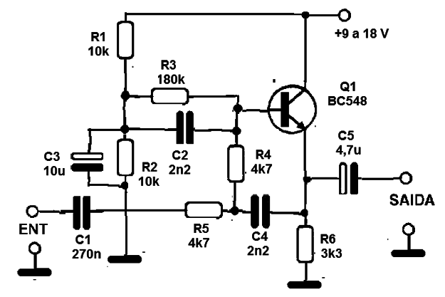 El scratch es el ruido de rascado que se produce cuando los discos de vinilo rayados se utilizan en un tocadiscos común. Por medio de recuperación, pasando el contenido de los discos de vinilo a su computadora u otros medios de comunicación, un filtro de graves como se muestra puede ser útil. El transistor puede ser BC548 o equivalente. El circuito es de una antigua publicación de 1986 ha sido modificado para operar con componentes nuevos. La alimentación se puede hacer con la batería o de la fuente, ya que el consumo es muy bajo. Cables de entrada y salida de señal deben estar blindados. Dos unidades, una para cada canal deben montarse para una versión estéreo. La fuente puede ser común a ambas unidades.