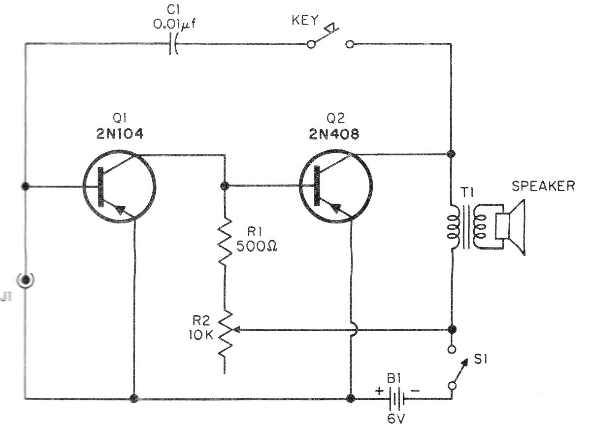 Encontramos este circuito en una publicación de 1964. El circuito es al mismo tiempo un amplificador y un oscilador para la práctica de la telegrafía con el sonido determinado por C1. El transformador es del tipo de salida para transistores y se pueden utilizar transistores BC558 en lugar de los tipos originales.