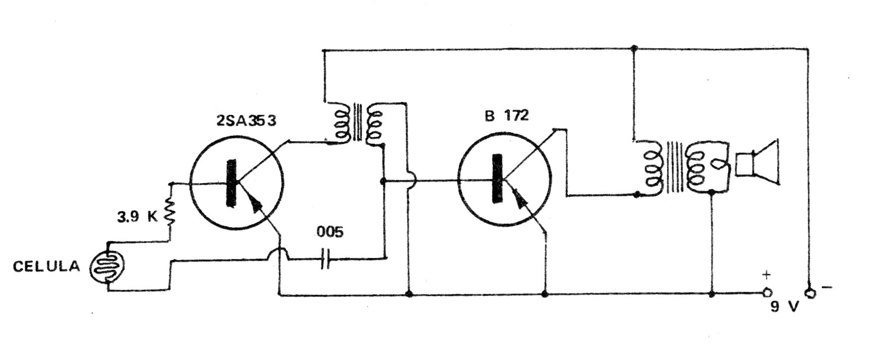 Los componentes críticos de esta alarma de una publicación de 1978, son los transformadores, ya que podemos usar transistores actuales como los BC558 en lugar de los originales. Los transformadores son del tipo driver y salida encontrados en radios transistorizados antiguos y amplificadores de pequeña potencia. El sensor es un LDR común y el sonido producido depende de la luz que incide en el sensor.