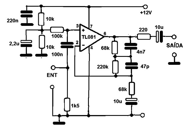 Este circuito se encontró en una revista italiana de 1988, pero se puede montar con facilidad, incluso con los cambios y el intercambio de componentes realizados por nosotros. El circuito está interpuesto entre una fuente de señal y la entrada de un amplificador que sirve como refuerzo de bajos. Una aplicación es en cine en casa, con la alimentación de un altavoz de graves. La fuente debe tener una excelente filtraje y el consumo es muy bajo. El TL081 admite equivalente. Os cables de señales de entrada y salida deben ser blindados.