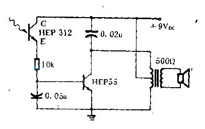 Este circuito, de una antigua publicación, puede emplear transistores de silicio como el BC548 y el transformador se obtiene de una radio transistorizada fuera de uso. El foto-transistor es de cualquier tipo y la alimentación se puede hacer con tensiones de 6 a 9 V. La frecuencia del sonido emitida se modifica de acuerdo con la luz incidente en el sensor. El altavoz puede ser de 4 ó 8 ohms y el capacitor de 0,05 uF (50 nF) puede tener su valor cambiado.