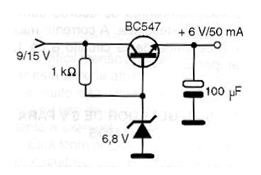 Con el micro regulador de tensión ilustrado en la figura podemos elaborar una fuente de alimentación para pequeños radios, calculadoras, relojes y otros aparatos cuyo consumo no sea mayor de 50 mA. La entrada se puede realizar con tensiones de 9 a 15 V. El diodo zener es de 400 mW y el capacitor electrolítico tiene una tensión de trabajo de 6 V o más.