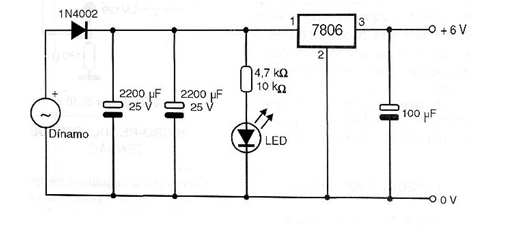 El circuito presentado en la figura está indicado para fuentes alternativas de energía como, por ejemplo, las obtenidas a partir de un dínamo de bicicleta. El dínamo puede ser acoplado a sistemas mecánicos de producción de energía tales como: caídas de agua, molinos de viento, etc. El circuito integrado 7806 debe estar dotado de un buen disipador de calor y la corriente máxima obtenida en la salida no debe superar 1 ampère. Con la presencia del regulador el circuito puede alimentar con seguridad pequeños aparatos electrónicos como radios, grabadores, etc., sin el peligro de sobrecargas causadas por la fluctuación de la tensión que un dínamo común presenta cuando en funcionamiento normal. El LED sólo sirve para indicar que la energía está siendo producida, y funciona como una carga para el circuito cuando no hay nada conectado en su salida.