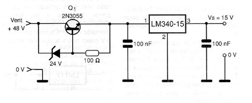 Para operar con tensiones elevadas de entrada utilizando un regulador de tensión de 3 terminales como el LM340-15, podemos usar el circuito indicado en la figura. Este circuito también sirve para circuitos integrados que no admiten más de unos 25 V de entrada. Tanto el circuito integrado regulador de tensión como el transistor de potencia 2N3055 deben montarse en buenos radiadores de calor. El diodo zener es de 1 W. Observe que en este circuito la tensión de salida es de 15 V, pero se pueden utilizar otros integrados con salidas diferentes de acuerdo con la aplicación deseada. La corriente máxima de salida de este circuito es de 1,5 ampères.
