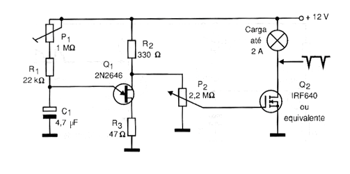 Los pulsos de luz producidos por este circuito son negativos, es decir, la lámpara da breves "apagados" a una frecuencia determinada por el ajuste de P1, y cuya profundidad es determinada por el ajuste de P2. El circuito que puede controlar las lámparas de alta potencia se ve en la figura. El capacitor determina la frecuencia y se puede cambiar en una amplia gama de valores.