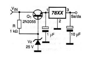 Los circuitos integrados reguladores de tensión de la serie 78XX no soportan una tensión de entrada mayor que 28 V para algunos tipos y 35 V para otros, dependiendo de la serie y del valor de la tensión de salida. Así, si tenemos una tensión mayor de entrada y necesitamos hacer una regulación de una baja tensión de salida, será necesaria una pre-reducción. Esto se puede hacer con el circuito mostrado en la figura, que admite una entrada de hasta 70 volts. La corriente máxima de salida de este circuito es de 1 ampère y el transistor de potencia 2N3055 debe montarse en un buen radiador de calor. El diodo zener de 25 V reduce la tensión de entrada del 78XX a aproximadamente 25,7 V, mientras que la resistencia R1 determina la corriente en el zener. El zener debe ser de 2 W y la disipación de la resistencia R debe ser calculada en función de la tensión de entrada, siendo un valor típico 2 W.