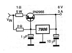 Los reguladores de tensión positiva de tres terminales, como los de la serie 78 XX (donde el XX es la tensión de salida), poseen su corriente máxima limitada en 1 ampère. Para obtener más corriente se puede hacer uso de un transistor PNP de potencia como el 2N2955, que debe montarse en un buen radiador de calor. El modo de lograr esto se muestra en la figura. La tensión de entrada debe ser por lo menos 2 V mayor que la tensión deseada en la salida, y el regulador deberá determinar la tensión de salida. Los resistores deben ser de hilo.