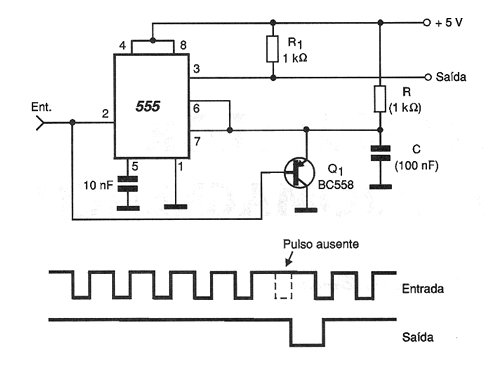 El circuito mostrado en la figura es bastante interesante en aplicaciones de control y alarmas. Este circuito detecta cuando falta uno o más pulsos en un punto de pulsos constante que se aplica a su entrada. La constante de tiempo R C debe calcularse de modo que sea un poco mayor que la dada por la frecuencia de la señal de entrada. De esta forma, en ausencia de un pulso en la entrada, hay tiempo para el circuito temporizar el pulso y volver a cero presentando así en su salida una transición negativa, como muestra el gráfico de la misma figura. Entre las aplicaciones de este circuito tenemos un eslabón de protección en el que se envía a través de un hilo una señal rectangular de frecuencia fija. Si este eslabón es interrumpido (hilo cortado) el detector colocado en el otro extremo del hilo acusa la falta de las muñecas y genera una señal de disparo. Otra aplicación sería en un sistema de monitoreo de datos en el que la ausencia de un pulso de sincronismo para la captura de estos datos puede fácilmente ser detectada disparando algún sistema de aviso. Observe que la alimentación de 5 V hace que este circuito sea compatible con la tecnología TTL y lo convierte en un shield para microcontroladores.