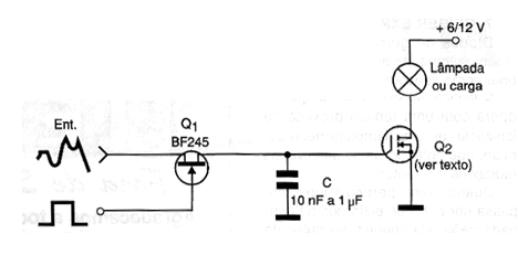 La altísima resistencia de entrada de un Power-FET posibilita la elaboración de un circuito de muestreo y retención para señales analógicas, bastante simples. En la figura tenemos el circuito básico para esta aplicación que funciona de la siguiente manera. Cuando el FET de unión (Q1) está habilitado, la señal a ser muestreada carga el capacitor C con la tensión que presenta en ese instante. Una vez deshabilitado, la tensión en el condensador se puede mantener durante un buen tiempo hasta el siguiente muestreo. Esta tensión de muestreo que está en el condensador determina la conducción del transistor de efecto de campo de potencia y, por lo tanto, la corriente en la carga.
