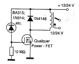 La corriente de fuga en un diodo polarizado inversamente, y que depende de la temperatura ambiente, puede polarizar un FET de potencia a punto de haber el accionamiento de un relé. Entre las aplicaciones prácticas podemos citar una alarma de sobrecalentamiento o incluso un detector de incendios. El circuito de la figura muestra cómo se puede hacer. El resistor de 10 M ohms en realidad, debe ser obtenido experimentalmente en función de la temperatura en que debe ocurrir su accionamiento y dependiendo del diodo. Su valor estará entre 2,2 M ohms y 47 M ohms típicamente. El circuito puede ser alimentado con tensiones de 6 a 24 volts dependiendo del relé utilizado. Si el diodo se instala lejos del circuito de accionamiento, el cable utilizado debe ser blindado para que los ruidos captados no provoquen el accionamiento errático del circuito o incluso la oscilación de los contactos del relé. El circuito se puede convertir en un sensor de luz haciendo el accionamiento del relé en el aumento de la luz incidente, si el diodo común es intercambiado por un foto-diodo.
