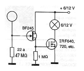 El circuito presentado en la figura puede indicar la presencia de cargas estáticas por el encendido de una lámpara indicadora de 6 o 12 V conforme la tensión usada en la alimentación. En el caso de un objeto cargado de electricidad estática como un peine roto, tenemos la variación de la corriente en el transistor de efecto de campo de unión (BF245 o equivalente) y con ello la polarización de la corriente se comporta del transistor de efecto de campo de potencia, encendiendo la lámpara. No debemos colocar el objeto cargado en el sensor, ya que una carga excesiva puede causar la quema del transistor de efecto de campo de baja potencia. El aparato se puede utilizar en clases de física para demostrar cómo los objetos se pueden cargar por fricción, inducción y contacto. La lámpara indicadora puede ser sustituida por otros dispositivos como, por ejemplo, un oscilador o un relé.