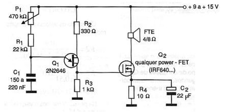 El circuito, mostrado en la figura, produce un tono de audio de buena potencia, cuya frecuencia es ajustada por el potenciómetro de 470 k ohms. El altavoz debe ser de al menos 5 W y una de las aplicaciones posibles para este circuito es en sistemas de alarma. El resistor de 10 ohmios puede eventualmente ser cambiado en función de la potencia deseada.